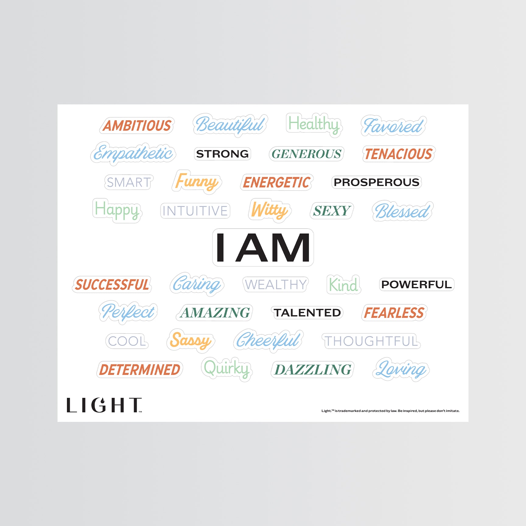 You can personalize the power word or short phrase printed on any Light.™ garment. You can also customize the wording on Silver Light Cards and create custom sticker sheets with your own power words.